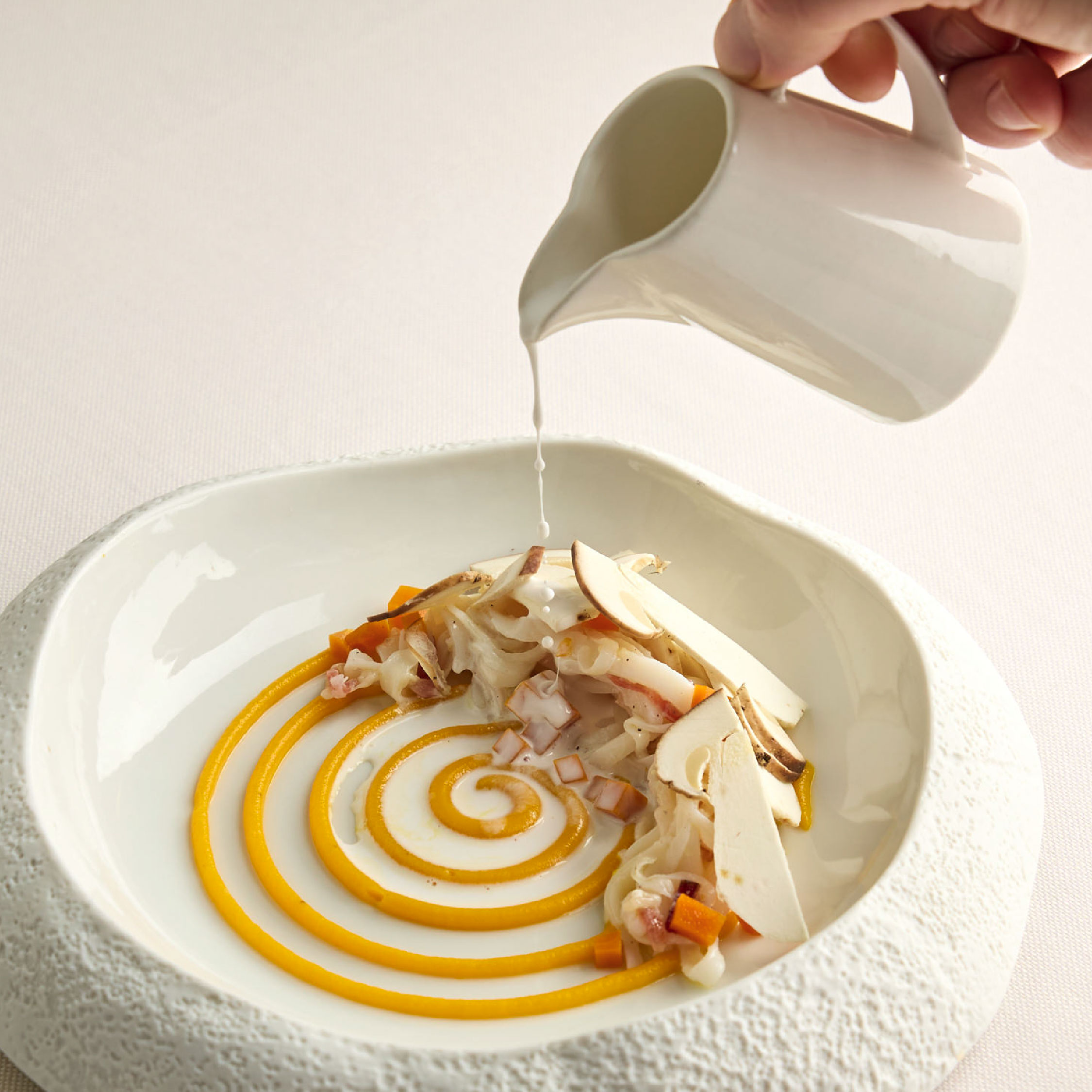 - Calamaro (tagliatella di calamaro, guanciale, zucca marina, latte di cocco, porcino crudo)